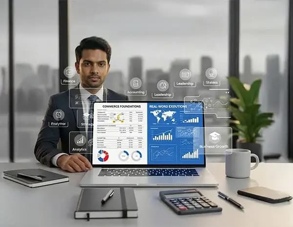 The online setup of this dual course is flexible and cheaper, so you can study from anywhere and still do internships, work, or start your own thing. This online program usually teaches you what's current in the business world, like digital business, using data to make choices, and how AI is changing management. This B.Com + MBA online course is great if you're sure you want to be a manager early on. It helps you get hired, earn more money in the long run, and stand out in today’s job market, where skills are super important.